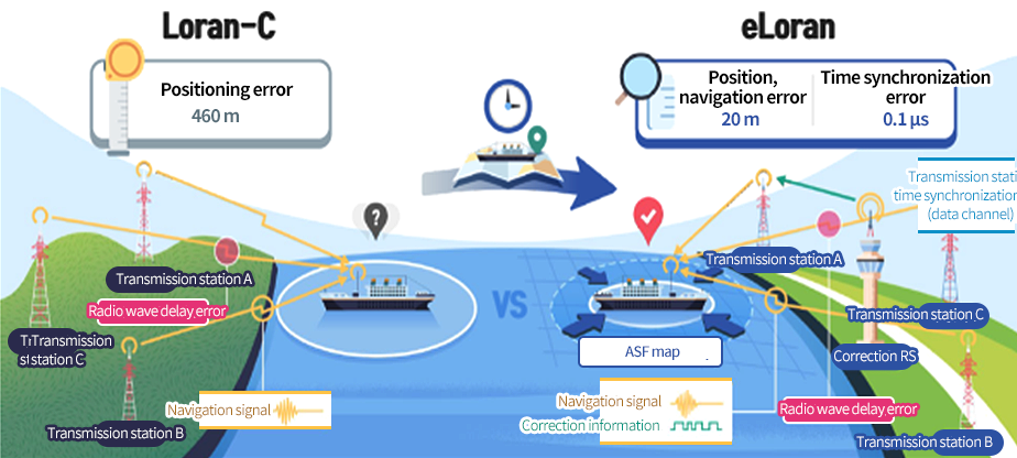 The enhanced LOng RAnge Navigation (eLoran) is a cutting-edge terrestrial navigation system that measures the time radio waves travel from at least three transmission stations on the ground to calculate positioning and provide precise time and frequency information. eLoran transmits low frequency (100 kHz) eLoran pulses to provide positioning, navigation, and timing (PNT) information. It has also improved positioning accuracy to less than 20 m through data transmission (Loran data channel; LDC) and error correction map (ASF map).