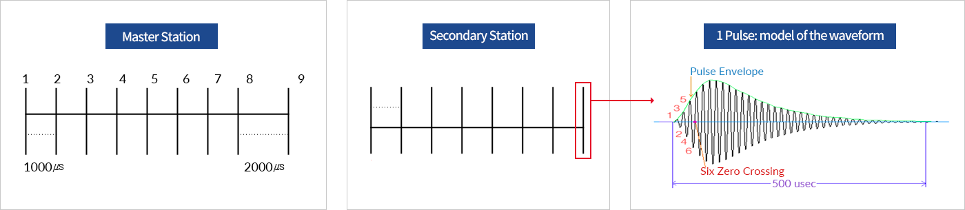 The purpose is to identify the master station signals and use blink. For secondary stations, a secondary station transmits only eight pulses and uses 100 kHZ as the carrier frequency in order to increase precision. This is called "cycle matching."