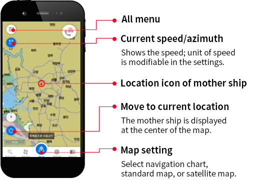 - 지도 설정: 해도, 일반지도, 위성지도 중 선택이 가능합니다.