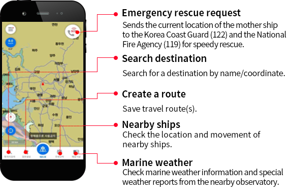 - 긴급 구조요청: 해양경찰청(122)과 소방청(119)으로 자선 위치 문자를 발송하여 빠른 구조가 가능합니다.